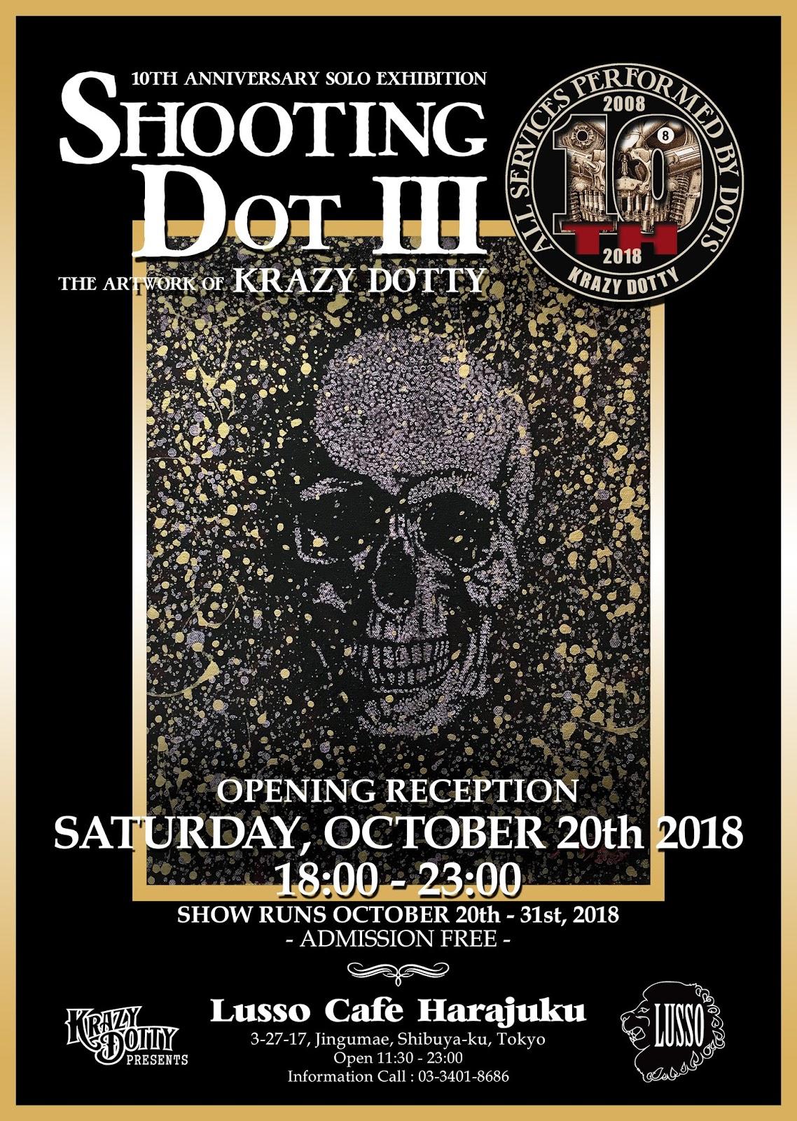 10月20日(土)から31日(水)まで原宿のLUSSO CAFE HARAJYUKUでアーティスト活動10周年を記念して個展を開催させていただきます。